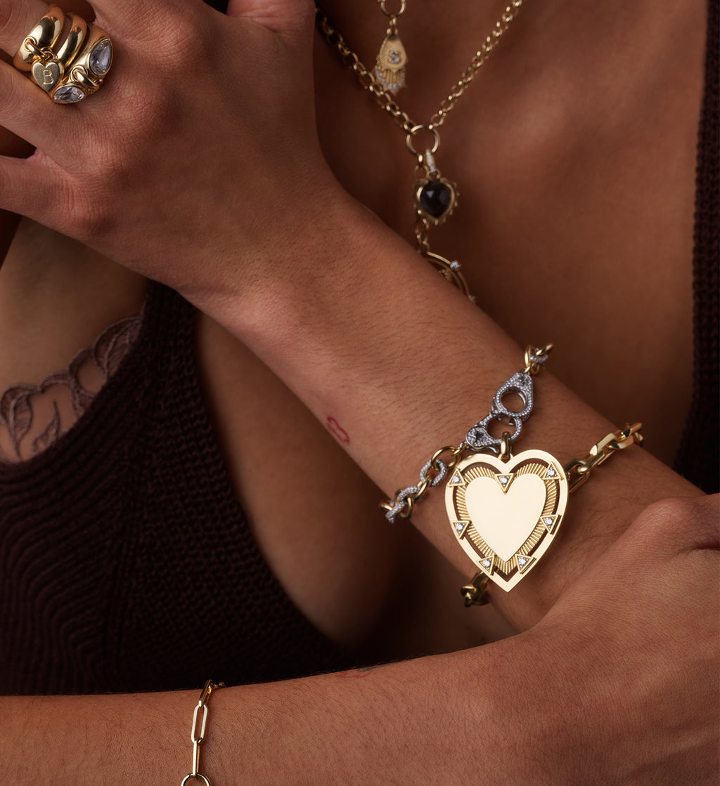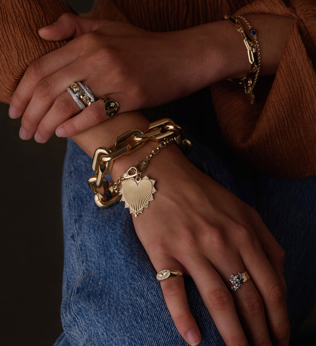 Make a confident statement with our collection of bold bracelets, designed to draw the eye with fine craftsmanship in 18K gold. Whether worn alone or layered, each FoundRae chain and bangle bracelet is designed to be paired with personally significant symbols, pendants or medallions— unique moments, memories, and beliefs that represent your individual story.