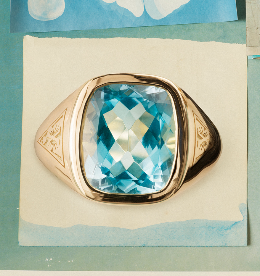 For our V MMXXIV (May 2024) Collector’s Series, I was inspired by the horizon, the place where the sky meets the sea. We went in search of pale blue aquamarines, a range of blue sapphires, and greenish-blue tourmalines. Each stone has been uniquely set in one of two designs—a rectangular Pendant or a Signet Ring with a symbol of Reverie, a butterfly paired with a spade, etched on the gold framing.