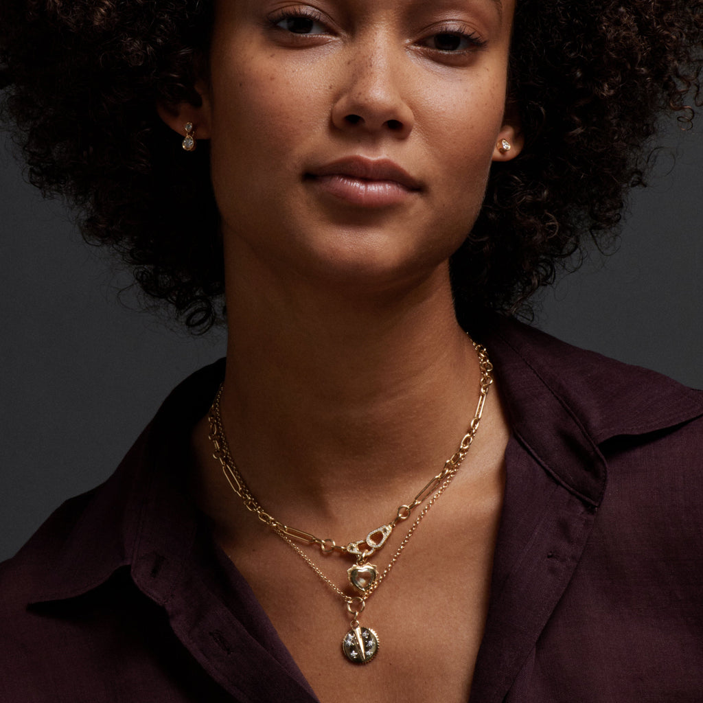 Crafted by master artisans, FoundRae gemstone medallions and pendants feature symbols drawn from our Tenets. Each design is thoughtfully realized in 18K gold and gemstones, and many are available in an array of sizes. Wear one medallion or layer several together to express significant moments, memories and beliefs. Each pendant or medallion is intended to be worn as a talisman that reflects your unique identity.