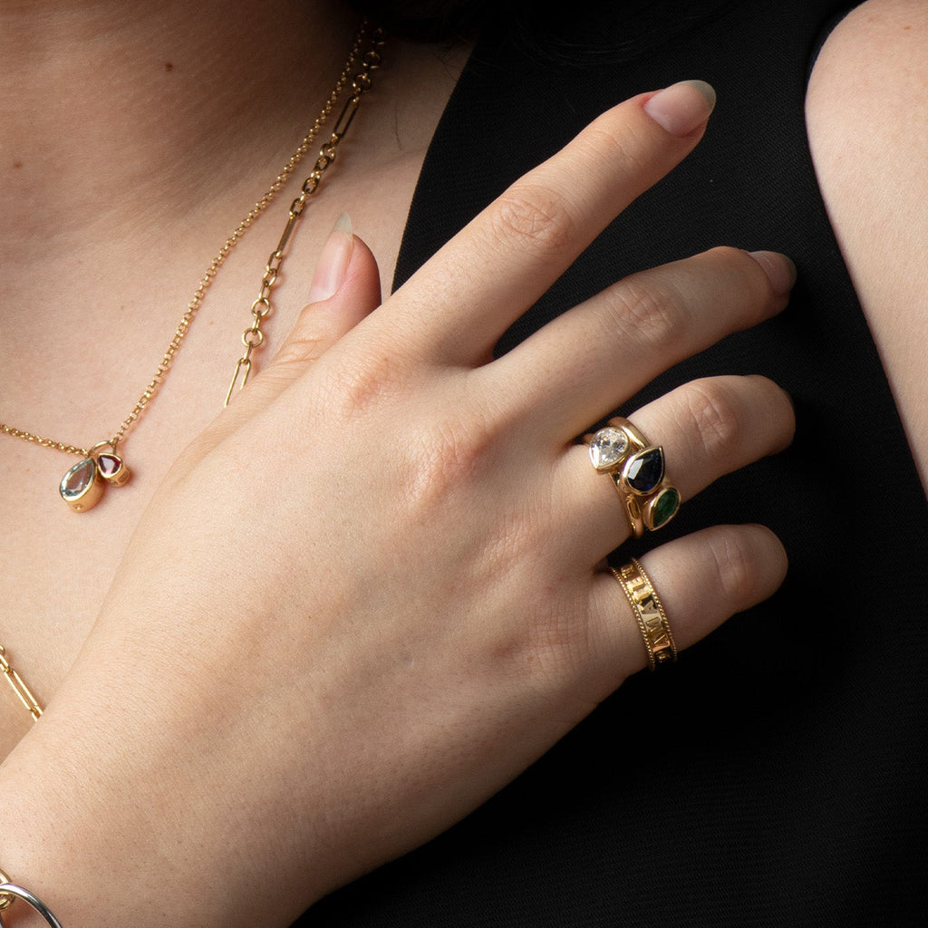 Explore our collection of 18K gold and gemstone rings, featuring symbols and motifs drawn from our Tenets. Each ring and band is crafted by master artisans, using only the finest gemstones. Whether you're celebrating a special occasion or selecting an everyday style, FoundRae rings express true meaning. Wear each one as a modern heirloom that reflects your unique identity.