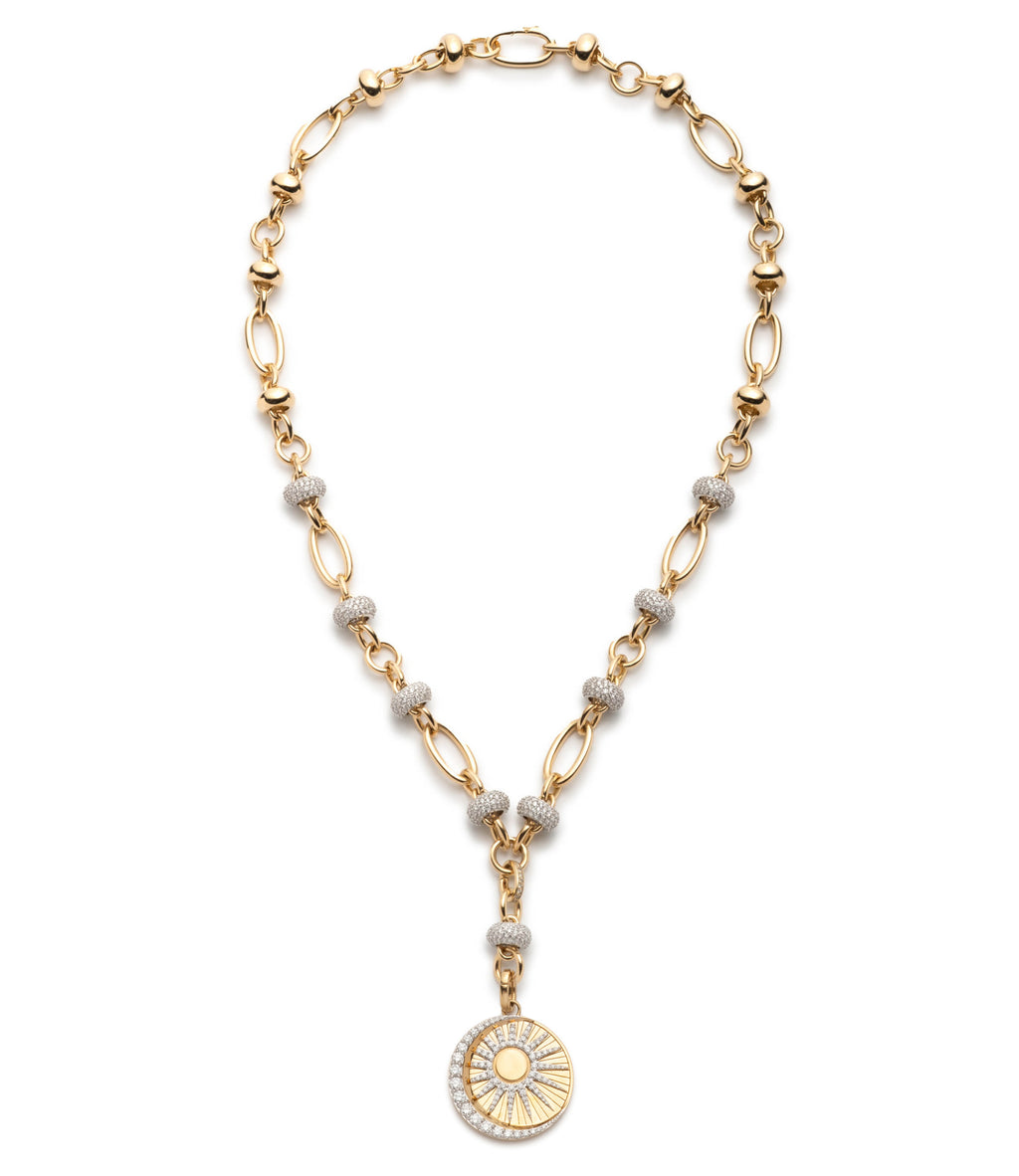 Crafted in 18k Yellow Gold and Pavé Diamonds, our Balance Orbit Extension Chain features the Balance Large Specialty Medallion with a pavé diamond sun and crescent moon motif, speaking to the two energies of lunar/solar, feminine/masculine, and yin/yang. All people have qualities of ambition, action, and passion as well as intuition, stillness, and acceptance—we must balance these energies within ourselves to become whole.