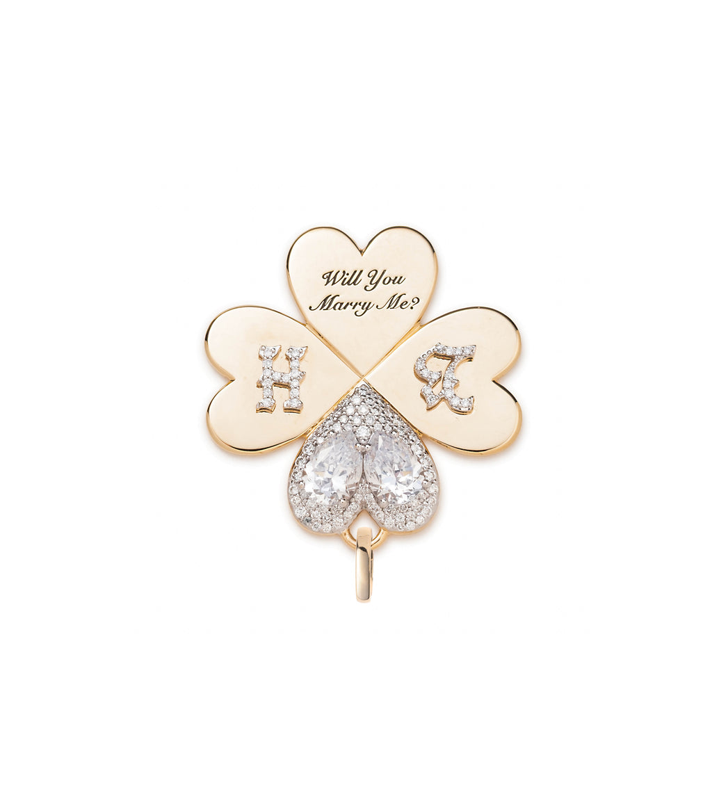 Make your commitment to love unforgettable with our Will You Marry Me Large Pendant, crafted in 18K yellow gold. The pendant features two pear-cut diamonds set amidst sparkling diamond pavé, up to two pavé diamond initials of your choice, and the words “Will You Marry Me?". The pear-cut diamonds are set in a heart, symbolizing a pairing in your life that just feels right, someone who is now a part of your heart forever—pears for a perfect pair.