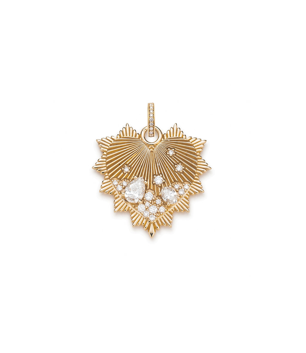 Crafted in 18k yellow gold with artfully scattered diamonds, our Medium Heart Medallion celebrates seven types of love as defined thousands of years ago by the ancient Greeks: Eros (romantic love), Philia (friendship), Agape (universal love), Storge (love between parent and child), Ludus (playful love), Pragma (love founded on duty & reason), and Philautia (self-love).