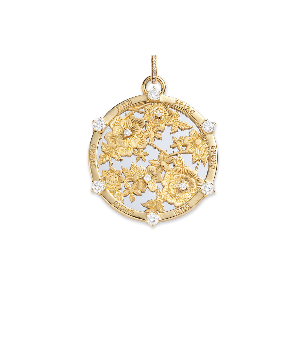 Crafted in 18k White and Yellow Gold with Diamonds, our Resilience Large Floral Screen Medallion represents the ability to withstand adversity and keep going. The engraved Latin phrase dum spiro, spero translates to, "as long as I breathe, I hope"— a reminder in times of adversity that the blossoms will bloom with abundance again.