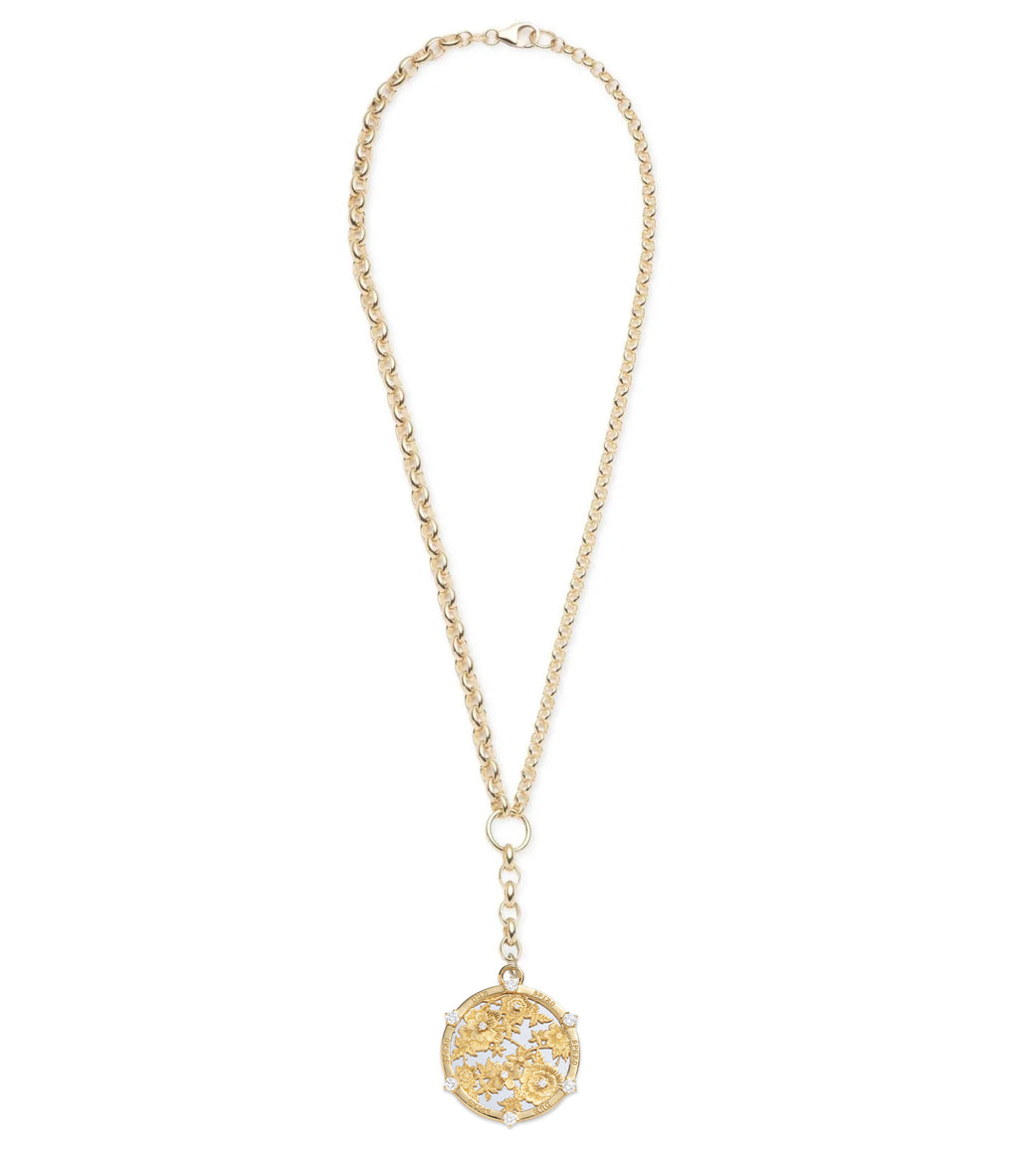 Crafted in 18k Yellow and White Gold with Diamonds, our Resilience Heavy Mixed Belcher Necklace with a Floral Screen Resilience Large Medallion represents the ability to withstand adversity and keep going. The engraved Latin phrase dum spiro, spero translates to, "as long as I breathe, I hope"— a reminder in times of adversity that the blossoms will bloom with abundance again.