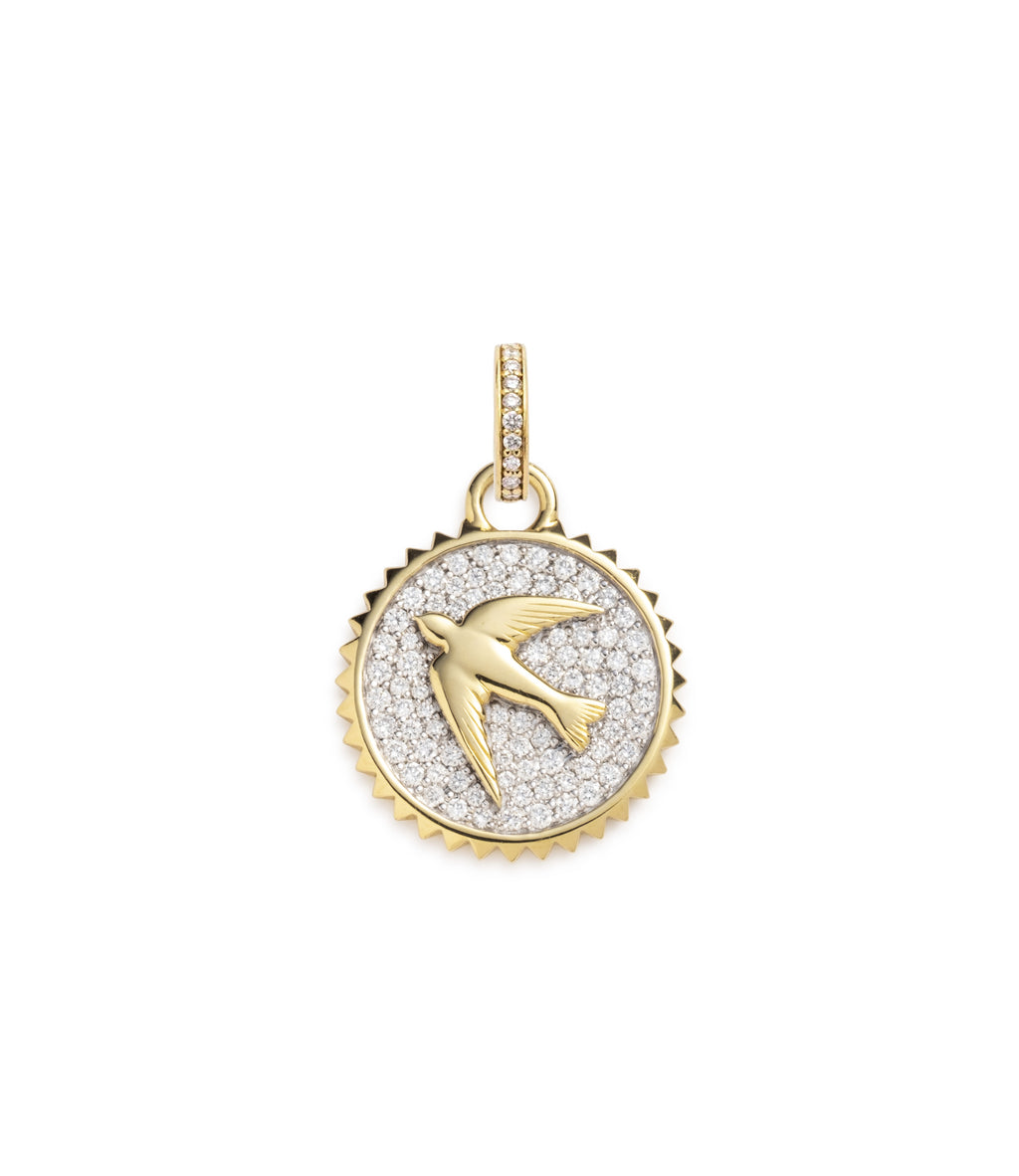 Crafted in 18k Yellow Gold with a sparkling pavé diamond ground, our Sparrow Baby Medallion represents Resilience. We chose the sparrow as a pictorial representation of its homophone spero, which means "I hope" in both Latin and Italian. The Latin phrase dum spiro, spero translates to, "as long as I breathe, I hope"—a reminder in times of adversity that the sparrow will sing again.