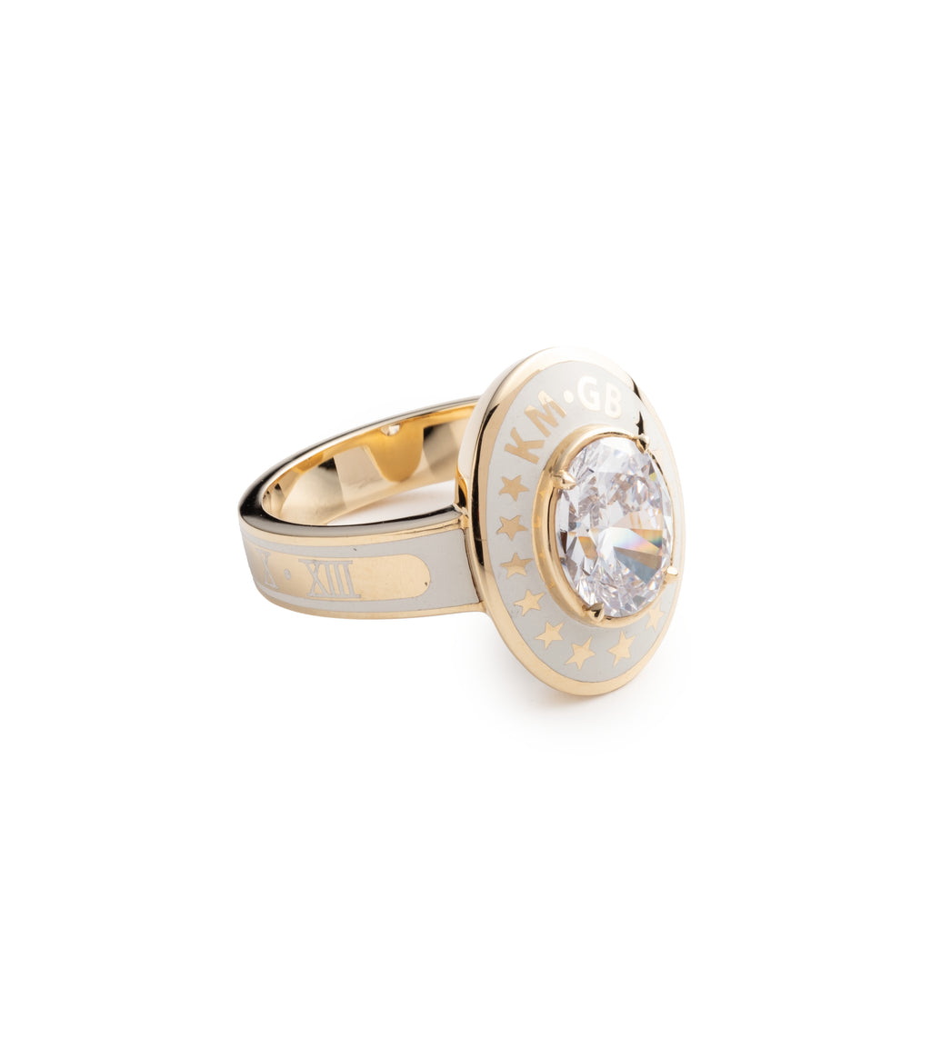 Crafted in 18K yellow gold and cream ceramic, our True Love Cigar Band features a center diamond. The ring is a visual reminder of love’s lasting bond, a tangible memento of two hearts united. Customizable to your unique story, the circumference of the band can be embellished with characters most meaningful to you. The quantity of characters is dependent on ring size.